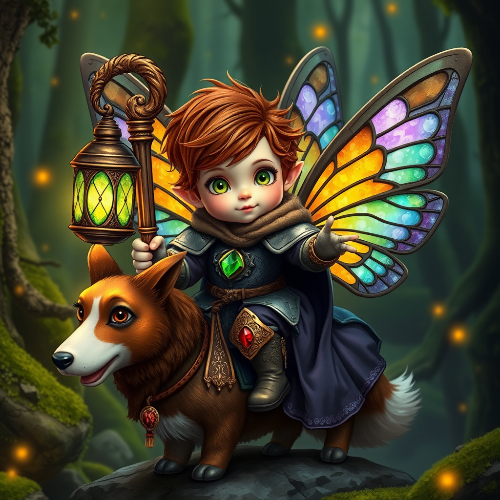 - Prompt: Gnome fairy child with tousled chestnut curls holding a polished oak staff lantern adorned with tiny emerald gemstones, riding a stout gnome corgi in ornate bronze knight’s attire with vibrant shimmering stained-glass wings in a dense forest with moss covered stones and glowing firefliea