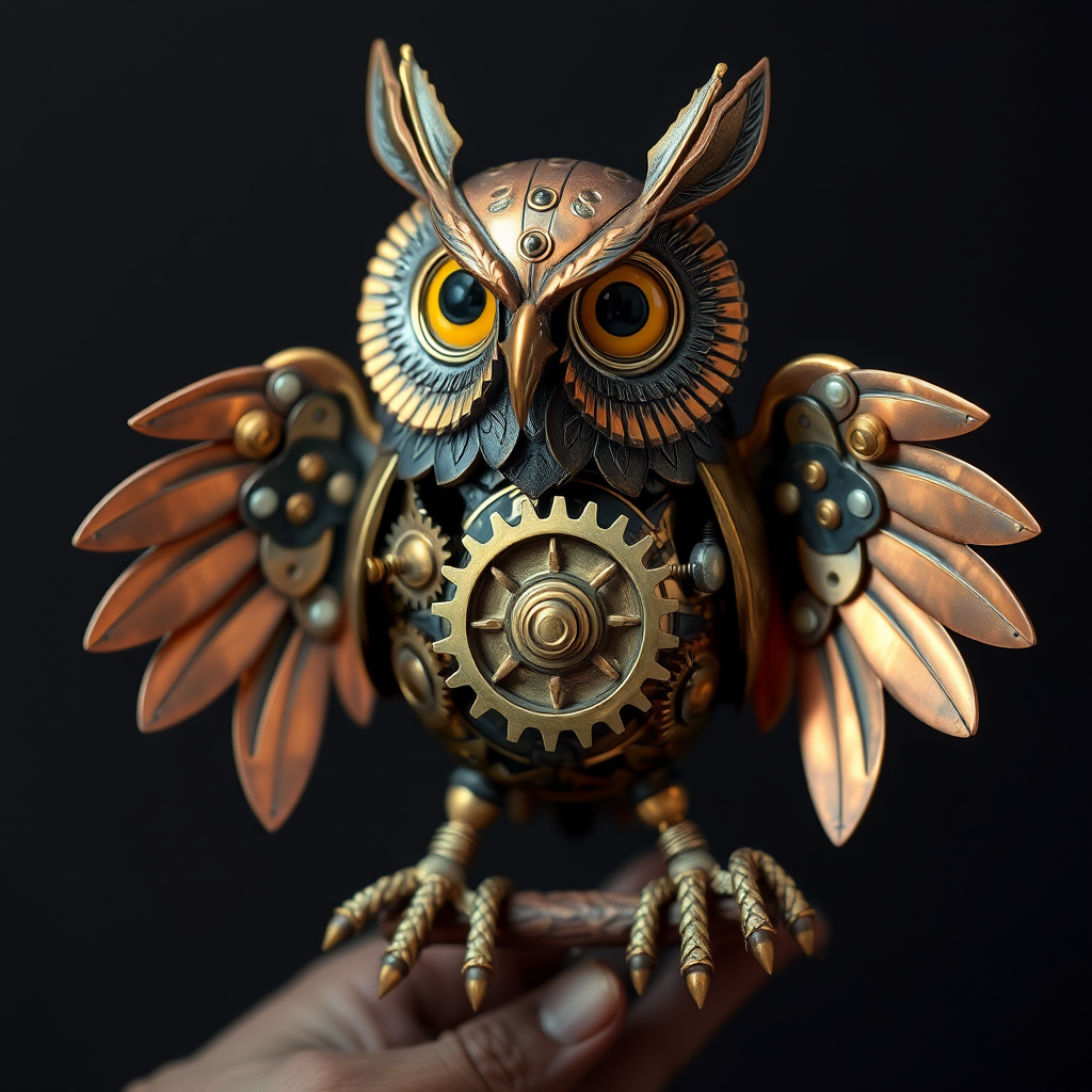 A steampunk mechanical owl with brass gears and copper wings!!!