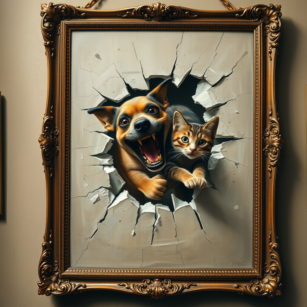 A whimsical, surreal, highly detailed oil painting of an ornate vintage framed artwork hanging on a gallery wall, where inside the painting an angry, exaggerated dog with bulging eyes and bared teeth lunges forward mid-chase, while a clever, wide-eyed cat bursts dramatically through the canvas to escape, tearing the painted surface as it leaps into the real world, half rendered in thick painterly brushstrokes and half fully dimensional. Shredded canvas curls outward, paint splatters frozen in motion, cracked varnish, aged linen texture, distressed antique surface, visible impasto, fine scratches, tears, and craquelure. Dynamic cinematic composition, playful absurdism, magical realism, fantasy narrative illustration, dreamlike lighting, rich storybook color palette, soft shadows, expressive motion. In the style of Roberto Innocenti, Benjamin Lacombe, Shaun Tan, Arthur Rackham, René Magritte (surreal influence), Tim Burton (painterly whimsy), with classical oil painting techniques, gallery-quality masterpiece, ultra-high resolution, best quality, highly imaginative.