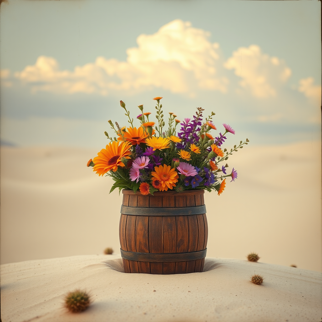 Create a folk art, hand painted antique canvas of a mysterious blurry cinematic photo featuring a vibrant still life of a bouquet of a variety of flowers in a brown half barrel on a pale dessert sand dune studded with small cacti. The barrel contains orange Desert Mallow, pink Penstemon-parryi, yellow Desert Marigolds and violet Mojave Asters. The lighting is soft and ambient. It's a calm dusty afternoon. A moody backdrop with a few puffy white clouds and drifting dust creates an silent atmosphere of calm. The image has finely detailed structures yet with uncertain textures, fine scratches, tears, and cracks in the paint in a style comparable to that of Gabriel Pacheco. This is an antique extreme canvas textured. Colors of, white snow, brown, tan, faded yellow, sea green and blotchy blue and violet shift into each other like sandy mist.