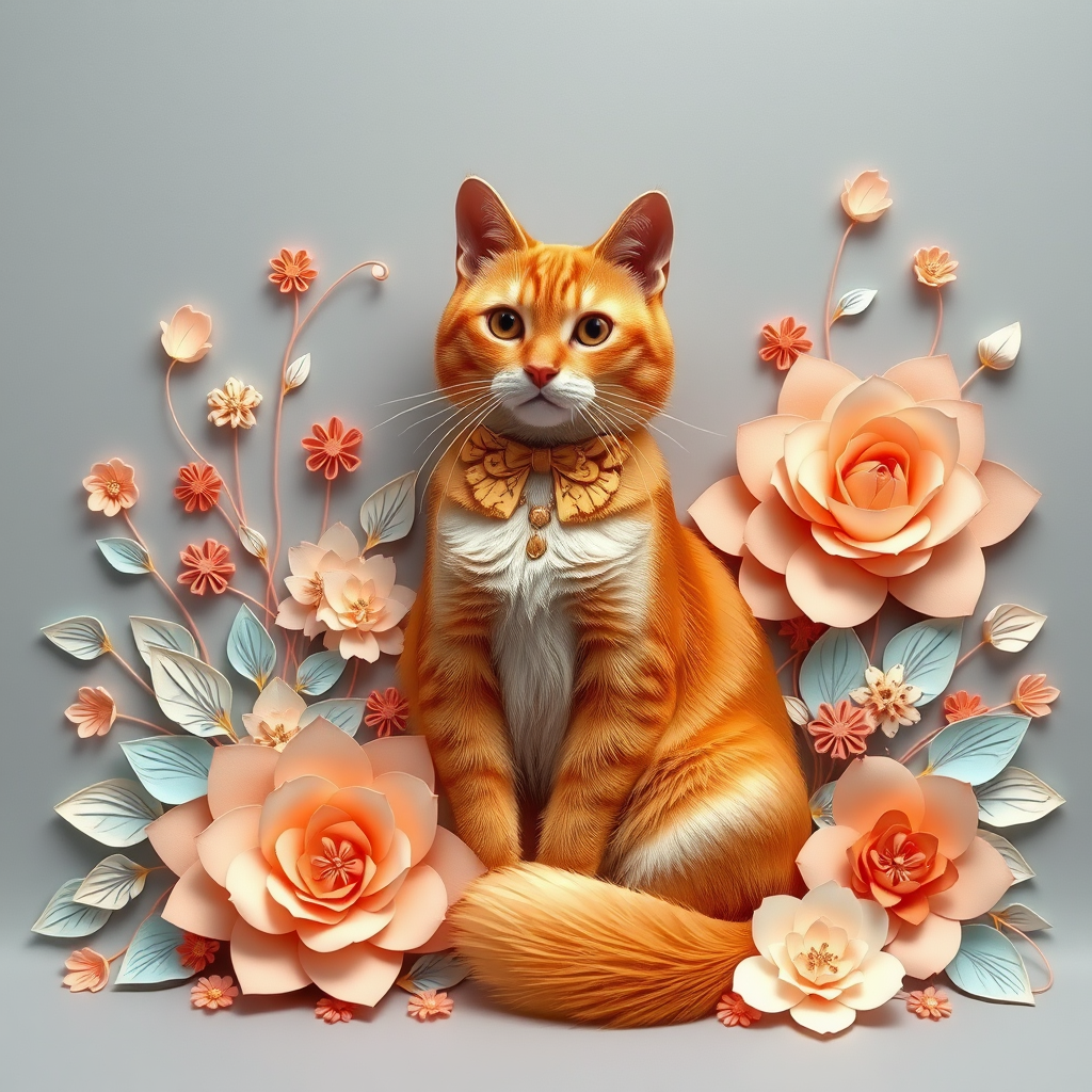- Prompt: An elegant orange tabby cat sitting regally among intricate, ornamental flowers. The entire scene is crafted in a surreal, quilled paper art style with fine, thread-like detailing. The flowers are composed of delicate pastel tones—peach, coral, sky blue, soft teal, and cream. The cat’s body seamlessly blends into the floral background with layered, concentric patterns. The atmosphere is dreamlike, with high detail, soft lighting, and a calm, grey gradient background. Hyper-detailed, ultra-high resolution, soft focus, fantasy realism.